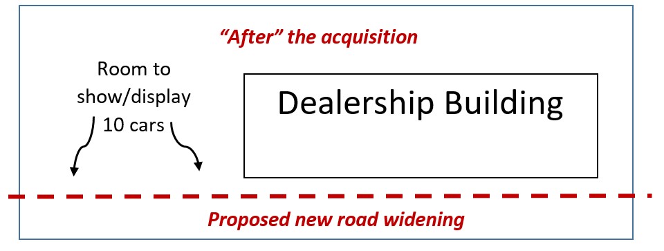 The highway department proposed that since they were only taking about 20% of the land, and none of the building, the highway department proposed a very minimal estimate of just compensation – about 5% of the total value of the site. However, the dealer was able to successfully show that the highest and best use of this site was for a car dealerships, and those were valued heavily on the ability to provide road-frontage display of cars. Hence, the loss of the ability to display 30 vehicles was a very real damage to the remainder. The Court accepted the dealer’s theory on this, and the just compensation was significantly higher than originally proposed.