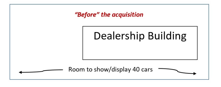 Let’s take a very simple example, which is actually drawn from our files from several years ago. A highway department wants to change the turn radius on a thoroughfare, and will “take” a slice of the front of a car dealership. The before-and-after sketch looks a bit like this: