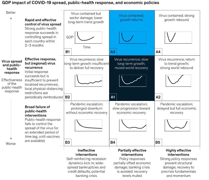 First, McKinsey constructed a common 3 X 3 matrix of low, medium, and high outcomes for Covid containment and economic impacts.
