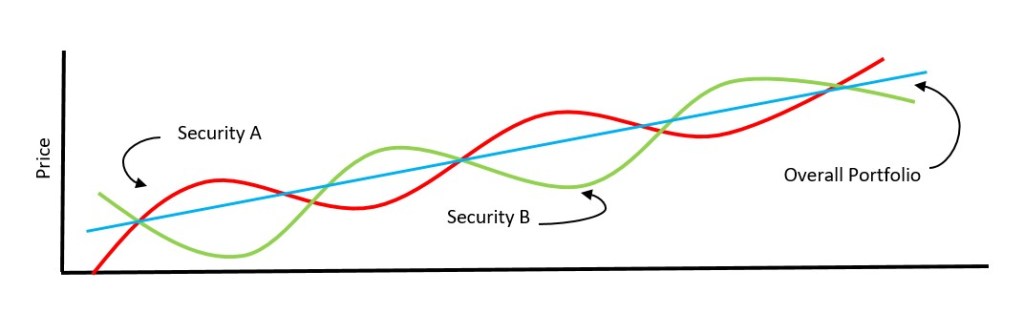 A diversified portfolio allocates investments in a way that reduces exposure to the volatility of any one asset. However, by itself, that’s not enough. The goal is to have a portfolio with less variance than the weighted average of all of the variances of the constituents, and in fact a well-diversified portfolio should have less overall variance than even the lowest individual security in the portfolio. In the figure following, assume you own just one asset, “Security A”. Its general trend over time is upward, but at any given point in time it may actually have declined in value, by cycling around the trend line. Now you add “Security B” to the portfolio. It is nearly perfectly counter-cyclical to A, and so the overall price trend is still solidly upward but with almost no volatility.