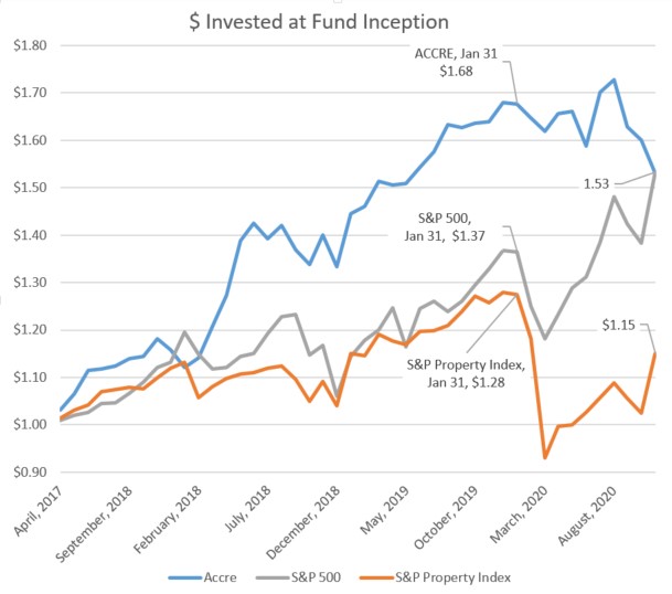The chart says it all — the past 3 months have been the worst stretch in the history of ACCRE. Ironically, it has been a very good period for the S&P and for REITs and real estate as a whole. Why, you ask? Simply put, we had positions adverse to student housing and other holdings that were laggards due to COVID, but the good news of November — which is good news for us all — caught us by surprise. Indeed, all of our losses happened in just a few days mid-month.