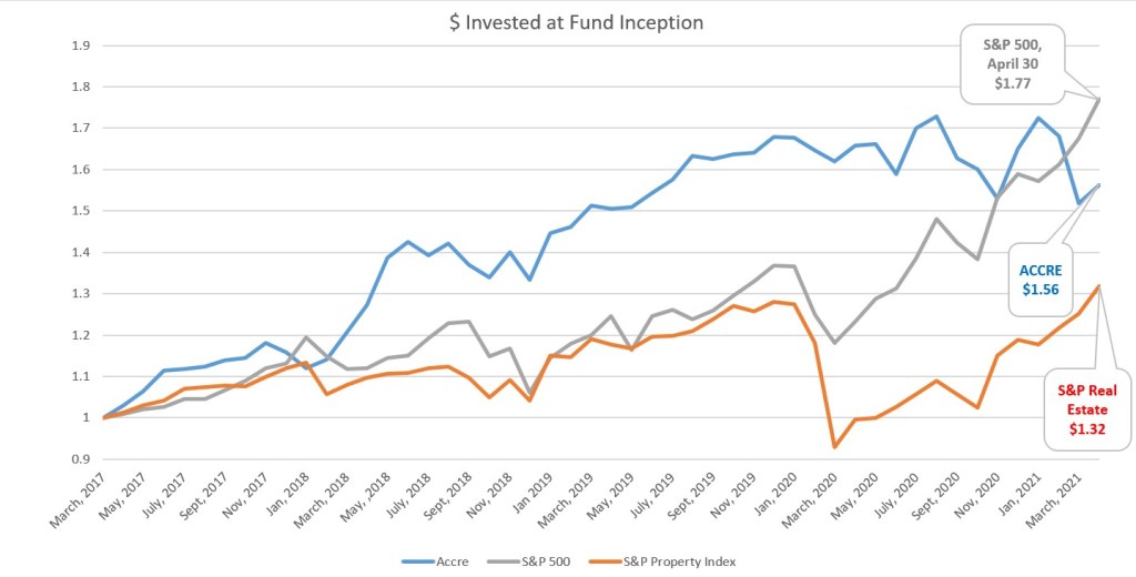 Not a bad month, as all things go, and certain a great month to own the S&P. With that in mind, the real estate sector continues to “figure out” what the post-pandemic world will look like. After two “down” months, ACCRE rebounded nicely in April, although we’re still behind the S&P both on a single-month basis and cumulatively. Nonetheless, some of our metrics (particularly diversification) make us continue to stay the course. So, on with the report…