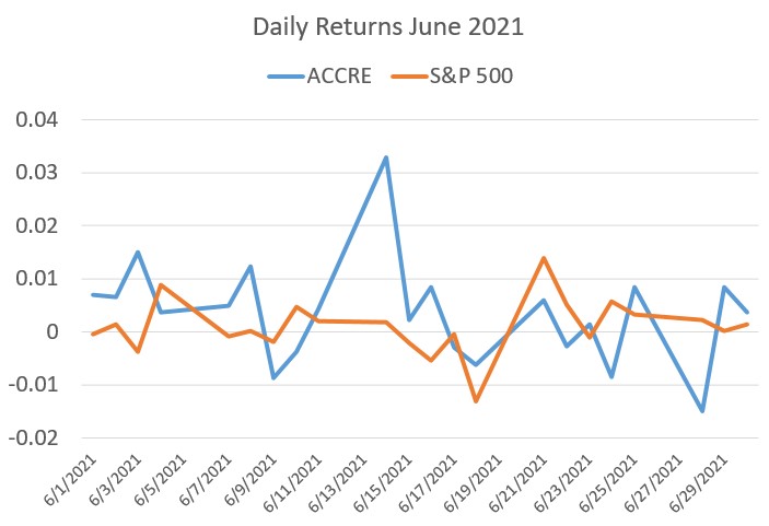 By the way, this month I’ve included a day-to-day graph of daily returns for ACCRE and the S&P just to visually demonstrate the lack of daily correlation.