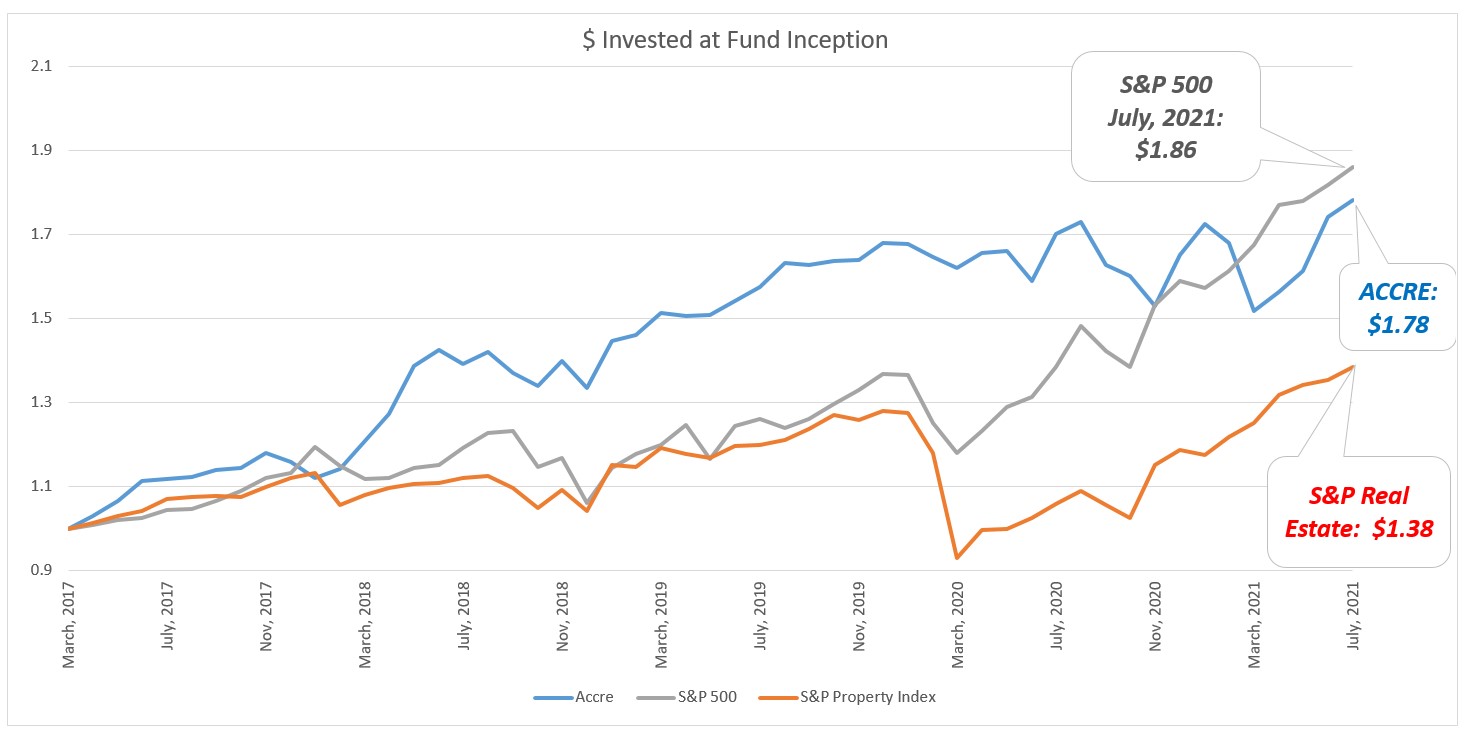 July was a “boringly good” month. I say that because ACCRE and other portfolio components all performed extremely well. ACCRE slightly outperformed the S&P (2.68% versus 2.27%) but neither of these can be sneezed at. The S&P Global Property Index had total returns of 2.36%, also a solid performance. I would note that the S&P broad market index has had 6 straight months of positive returns, and 17 positive months out of the past 24. As such, ACCRE is competing in rarefied territory.