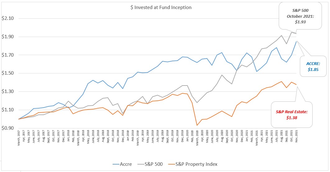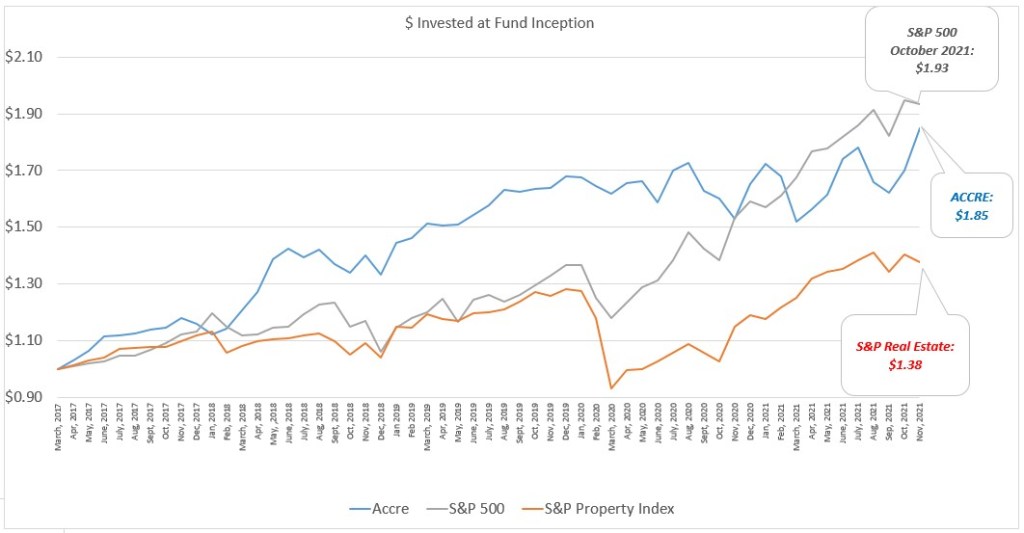 To be specific, the S&P 500 declined 0.83% in November. Don’t get me wrong, though, we hate to see that as much as anyone. Real estate in general also took a hit — the S&P Property Index was down 2.12%. However, ACCRE was up 8.44%, the second of two very solid months of returns. Thus, a dollar invested in ACCRE at the inception would be worth $1.85 today.