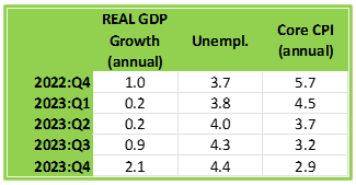 For the 4th quarter 2022, which we’re now in, the consensus agreement is that REAL GDP should grow at about 1.0 percent on an annualized basis, which is not much but certainly not “recession”. The consensus opinion is that REAL GDP will be nearly flat in the first half of 2023, then rising slowly to an annualized rate of 2.1% by the end of next year. For the uninitiated, something between 2% and 4% is usually considered to be a healthy, stable rate for a mature economy. Emerging economies, like China, need growth rates double that or more. Two quarters of negative GDP growth signals a recession.