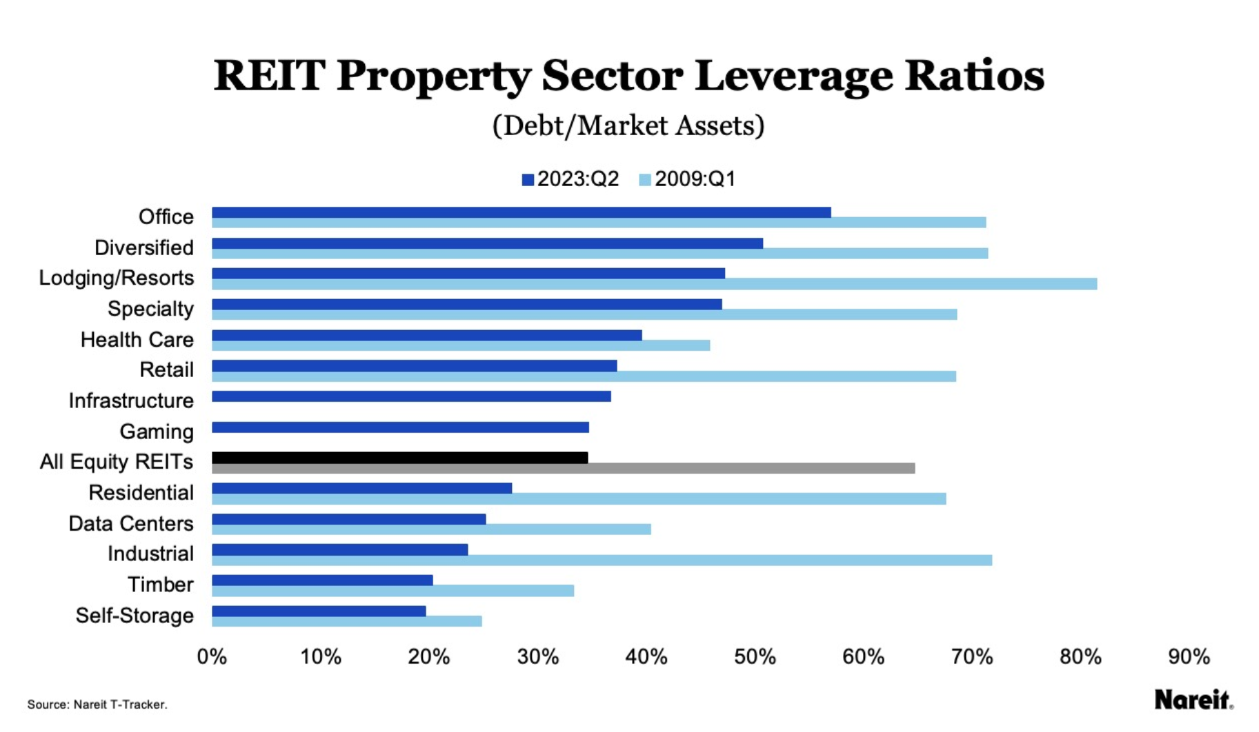 Over the past few weeks, I’ve reported on several REIT sectors, with a particular focus on debt levels. It may be important to put this in context. According to NAREIT, over the past four years, every equity REIT sector tracked has shown a marked decrease in leverage relative to the market value of assets. Now, part of this stems from the very real run-up in real estate asset prices both during the pandemic as well as afterwards as investors sought hedges against inflation. Nonetheless, from our own observations, most REIT managers appear to be cautious in their use of debt right now, particularly as the quality of assets to be acquired remains questionable.