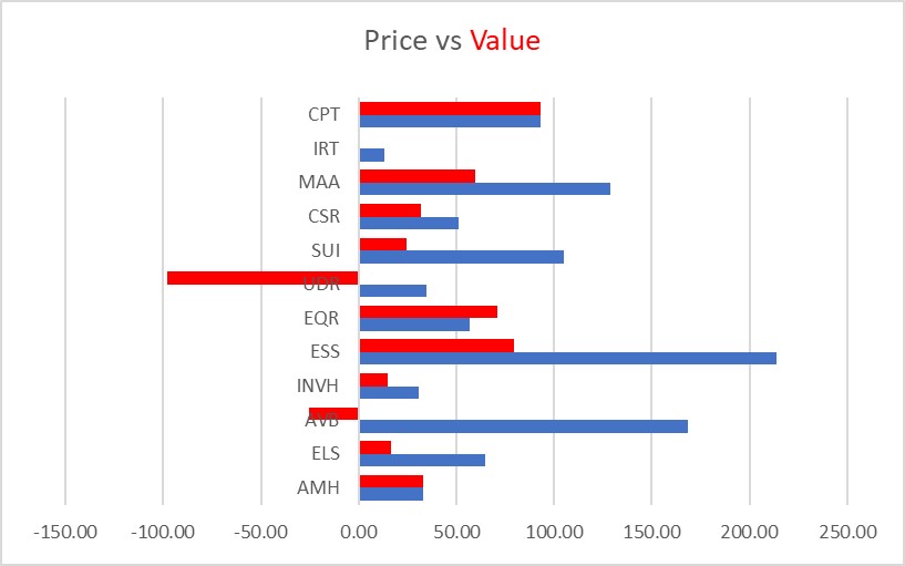 To test this out, I’ve examined all of the Residential REIT shares we looked at earlier this month which reported positive earnings per share for the 2nd quarter. I’ve used the more conservative version of the model. For “g” I’ve used the annualized 5-year growth expectations of industry analysts as reported by Yahoo finance and the Moody’s seasoned AAA rated long-term bond yield as of the end of September (5.13%). The results suggest that nearly all of the REITs are presently trading above intrinsic value, and only two (CPT and EQR) are slightly below. Indeed, two of the REITs show negative intrinsic value, because analysts project negative annualized growth rates for those REITs over the next five years.