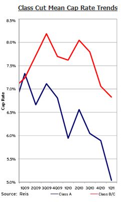 The more interesting piece of news comes out of our friends at REIS, who just released a report today showing that Class “A” apartment cap rates have declined much faster than Class B/C, indicating that high-end, investment grade properties are much in favor today for their income by institutional investors.