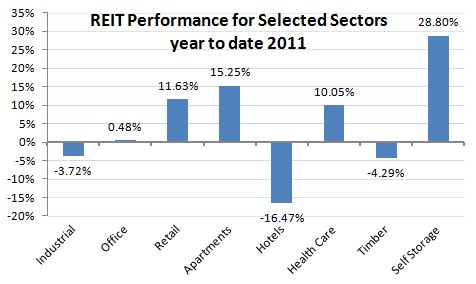 Globe Street has a great piece about the self storage market, which is doing very nicely lately. Top firms in the fiele had revenue growth of 4% to 5.8% in the 3rd quarter, with net operating income growing 7.3% to 8.6%. ranged as high as 91.7% at Public Storage. The article properly notes that this sector is now joining apartments in strong, positive territory. Overall REIT share performance, as noted in the chart below, certainly underscores this (YTD as of October 2011, data courtesy NAREIT).