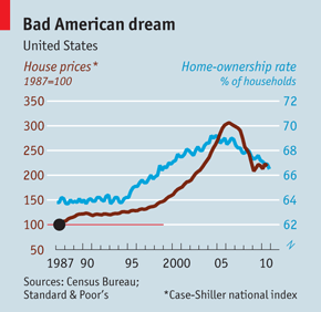 With all the obvious sucking-up out of the way (and no, I don’t get a free subscription — I pay for mine just like everyone else), the current issue has a stellar article titled “Suspended Animation” about America’s Housing Market. In prior missives on this blog, I’ve drawn linkages between the home ownership rate (currently at about 66%) and the housing bubble (best visualized with the Case-Shiller Index). The article makes that same comparison, without drawing the conclusions I do (see below).