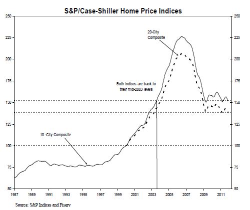 More importantly, though, an increase in housing demand (and prices) led us out of prior recessions, but housing is continuing to be a drag on the market following this most recent one. Unless and until the housing market doldrums stabilize, solid economic growth will elude us.