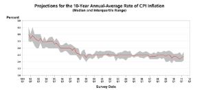 One piece of good news — and this may be the FED patting itself on the back a bit — is that its inflation projections have been quite accurate over the years, and they continue to forecast exceptionally low CPI changes over the next ten years. While the median forecast is up slightly from last quarter (2.4% up from 2.3%), this continues to be great news for consumers and bond-holders. Notably, as you can see from the graphic, there is a fair degree of agreement among economists surveyed — the interquartile range is less than a percentage-point.